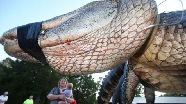 Un alligatore gigante di quasi 5 metri, pesante 500 chili, è stato catturato e ucciso da cinque membri di una famiglia a Thomaston, nell'Alabama, dopo 10 ore di lotta. I biologi del Wildlife and Freshwater Fisheries sono riusciti a misurarlo, ma il rettile pesava talmente tanto che ha spaccato il dispositivo usato per pesarlo. Alla fine è stato prelevato da una scavatrice e messo sulla bilancia: è il più grande alligatore mai ucciso in Alabama.