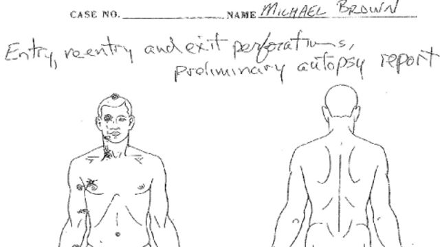 Uno dei proiettili è entrato nella parte superiore del cranio del giovane nero, suggerendo che la testa era piegata in avanti quando lo ha colpito causandone la morte. A sostenerlo è il dottor Michael M. Baden, l'ex capo di medicina legale di New York, volato in Missouri su richiesta della famiglia di un'autopsia separata. Mike Brown è stato pure colpito quattro volte al braccio destro, ha spiegato il medico.