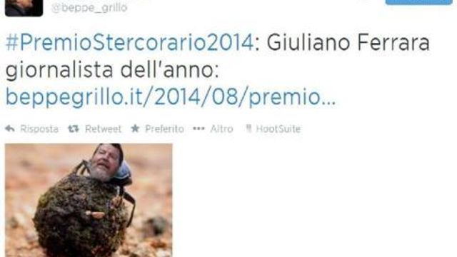 Giuliano Ferrara è il vincitore del sondaggio "giornalista del 2014" lanciato sul blog di Grillo. A proclamare la sua vittoria è il leader del M5S che commenta l'esito via Twitter con un fotomontaggio del direttore de Il Foglio nei panni di uno stercorario, lo scarabeo che si nutre, appunto, di sterco. Sul podio, al secondo posto c'è il vicedirettore del Corriere, Pierluigi Battista, mentre al terzo Corrado Augias, giornalista di Repubblica.