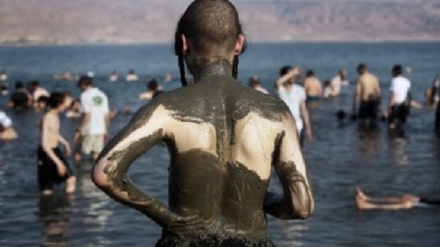 Lontani da Gaza un gruppo di ebrei si cosparge il corpo con i fanghi nutrienti del Mar Morto, nel tratto di spiaggia dove hanno accesso solo gli uomini. Come di rito gli ultra-ortodossi trascorrono le loro vacanze nei territori occupati del West Bank.