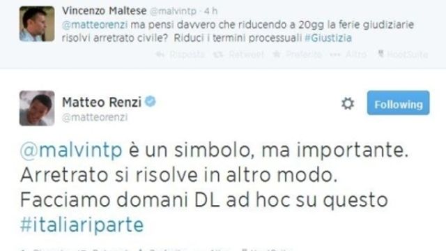 Di giustizia e tribunali Renzi si occupa in un altro tweet, sempre in risposta ad un suo follower che ha preso come esempio positivo "la storia del tribunale di Torino" da cui "tutta l'Italia dovrebbe prendere esempio". "Sono d'accordo", è la risposta del premier, che aggiunge: "Mario Barbuto, che ha risolto i problemi della giustizia di Torino è adesso a Roma a lavorare con Andrea Orlando".