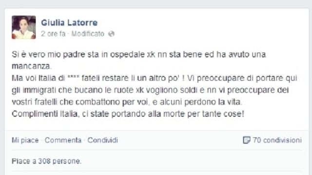 "Che bella notizia... Mio padre ha l'ischemia. Purtroppo le belle notizie non ci sono mai, solo notizie del ****". "Ora con questo problema deve restare molto là, mentre voi state a dire sempre le stesse c...te?!". Lo scrive su Facebook Giulia Latorre, figlia di Massimiliano. In un post precedente, successivamente rimosso, la ragazza aveva scritto: "Sì, è vero, mio padre sta in ospedale. Ma voi Italia di m...da fateli stare lì un altro po'!".