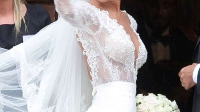 Un abito che ha attirato l'attenzione, e i flash, di tutti i fotografi quello scelto da Ludovica: a sirena, in pizzo, con un velo lungo e ricamato, bouquet di rose bianche in mano e... una scollatura profonda che lasciava intravedere molto di più di quanto ritenuto "consono" per un matrimonio religioso. A coprire il seno delle coppe color pelle, schiena scoperta e un vitino da vespa sottolineato dal gioco dei tessuti in contrasto. Un abito più sexy di così era davvero difficile da scegliere. Destro, invece, indossava un abito scuro molto elegante con una bottoniera che richiama i fiori scelti dalla Caramis.