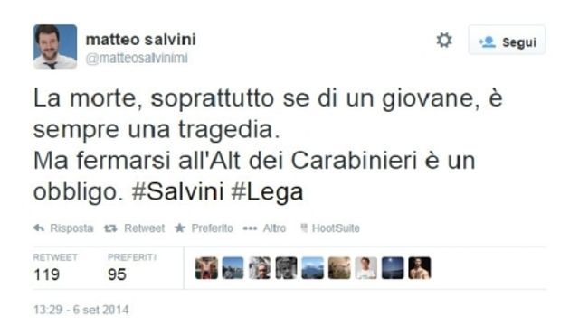 Polemiche dopo un tweet del segretario della Lega Nord, Matteo Salvini, che, commentando la morte di Davide Bifolco, il giovane ucciso da un carabiniere a Napoli, ha scritto: "La morte, soprattutto se di un giovane, è sempre una tragedia. Ma fermarsi all'alt dei carabinieri è un obbligo". Tra i primi a replicare, il capogruppo dei deputati di Sel, Arturo Scotto: "Sparare a un ragazzo che non lo fa, è inaccettabile. La vita vale di più".