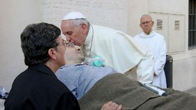Lo ha salutato, gli ha sorriso e gli ha dato un affettuoso bacio sulla fronte. Così Papa Francesco si è accostato a Salvatore. A 18 anni l'uomo rimase paralizzato durante una gara di judo e da allora è uscito di casa soltanto in due occasioni. La prima è stata per andare a vedere il mare, la seconda per raggiungere Città del Vaticano, dove ha visto il Santo Padre e ricevuto il suo conforto.