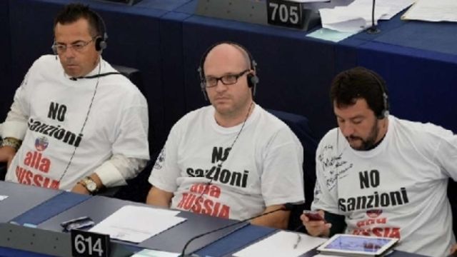 Da Strasburgo a Roma, giornata di proteste per la Lega Nord. All'Europarlamento il segretario federale, Matteo Salvini, Gianluca Buonanno e Lorenzo Fontana hanno indossato una maglietta per contestare le sanzioni disposte dall'Ue nei confronti della Russia per la crisi ucraina. E Buonanno si è anche esibito in qualche gesto poco "onorevole". A Roma, invece, i deputati del Carroccio hanno chiesto un referendum per l'indipendenza del Veneto.
