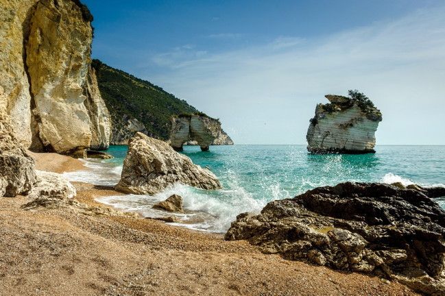 Vieste - È una serie di dune sabbiose che digradano, con un fondale basso che si inoltra lentamente nel mare. Di difficile accesso, è costeggiata dalla strada litoranea e da pinete lussureggianti. È molto attrezzata con strutture ricettive e di svago, con spiaggia attrezzata, noleggio natanti, ristorante e bar. Racchiusa da due piccoli promontori è ideale per famiglie con bambini. Si consiglia la visita alla cosidetta “Tomba di Noè”, ubicata nelle vicinanze e risalente alle prime colonizzazioni illiriche, provenienti dalla costa opposta dell’Adriatico.