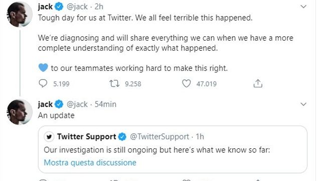 "Giornata difficile per noi a Twitter. Ci sentiamo tutti male per quanto accaduto. Stiamo diagnosticando e condivideremo tutto il possibile quando avremo un quadro più chiaro di quanto accaduto". Lo twitta Jack Dorsey, il fondatore e amministratore delegato di Twitter dopo la violazione di alcuni account vip. Per il New York Times l'attacco, "efficace ma amatoriale", lascia pensare che sia stata l'opera di un singolo hacker e non di uno Stato.