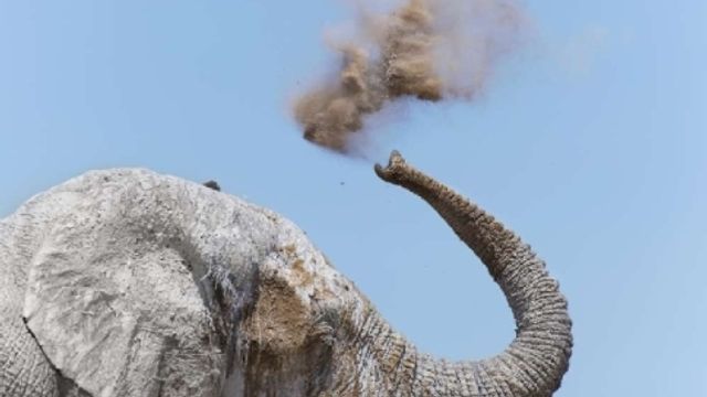 Per difendersi dalla calura africana e dagli insetti, gli elefanti usano un espediente alquanto particolare. Con la proboscide si cospargono di terra e polvere: una toelettatura senza acqua, in un periodo in cui le piogge scarseggiano, ma che si rivela molto efficace. Le immagini della "doccia" di terra del pachiderma sono state scattate presso il Parco nazionale Etosha, in Namibia.