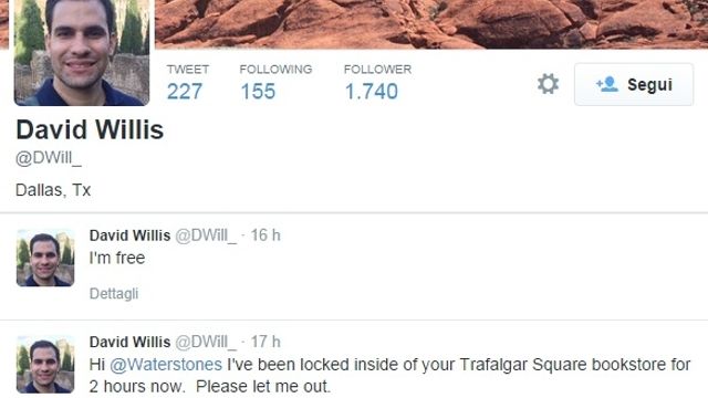 Salvato da un "cinguettio" - A quel punto, Willis ha deciso di pubblicare un appello su Twitter: "Sono chiuso nella libreria Waterstones da due ore. Per piacere, portatemi fuori". Decisamente diverso il risultato: in migliaia hanno risposto alla sua richiesta d'aiuto, finché la polizia si è presentata alla porta con un custode per liberarlo. E' proprio il caso di dirlo: dove non ha potuto Scotland Yard, è arrivato il cinguettio di Twitter.