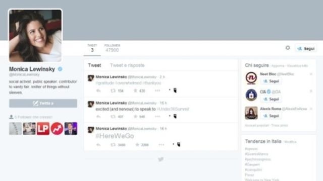 Monica Lewinsky sbarca su Twitter. E l'ex stagista della Casa Bianca che inguaiò Bill Clinton dopo poco meno di un giorno può contare su oltre 47mila follower. "E' il tempo di voltare pagina", aveva detto la donna, oggi 41 anni, in un'intervista a Vanity Fair con cui aveva rotto il suo lungo silenzio, nel maggio scorso. L'esordio sul social network è stato con un semplice hashtag: #HereWeGo.
