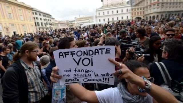 Manifestanti: "Sbloccare subito i fondi" - I manifestanti, in piazza con le bandiere di Genova e il Tricolore, chiedono poi l'immediato sblocco dei fondi stanziati per il dissesto idrologico, la messa in sicurezza del territorio da parte del governo e lo stanziamento di fondi per il risarcimento dei commercianti genovesi e di tutti i cittadini nuovamente e duramente colpiti dall'alluvione.