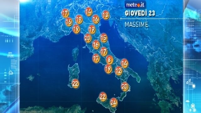Le previsioni per giovedì - Dal mattino cielo sereno o poco nuvoloso su gran parte del Nord e del medio Tirreno con nubi associate a nevicate fino ai 1000 metri sulle Alpi orientali di confine. Nubi irregolari e variabili altrove con piogge o rovesci soprattutto dal pomeriggio su medio e basso Adriatico e basso Tirreno, mentre sull'Appennino centrale la quota neve sarà in discesa verso sera fino ai 1200 m. Temperature in generale diminuzione, eccetto le massime al Nordovest. Minime sotto i 10 gradi in gran parte del Centronord, massime decisamente sotto la media sulle regioni del medio e basso Adriatico dove difficilmente supereranno i 15 gradi.