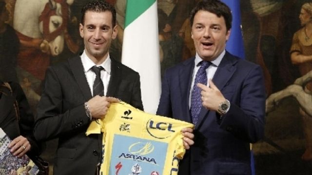 "Chi conosce il ciclismo sa che questo signore qua ha vinto Giro e Vuelta prima del Tour. Nibali è molto più che un atleta, è un simbolo e sono felicissimo di averlo a Palazzo Chigi - le parole del premier -. Durante il Tour gli ho mandato messaggini dicendogli che lo aspettavamo e lui e' venuto con la maglia gialla, quindi e' una grande vittoria dell'Italia e anche un sogno straordinario di un campione che a mio giudizio e' un punto di riferimento per i più giovani. Sono felice di ospitarlo qui e sono sicuro che tutti gli italiani gli sono grati per le emozioni che ci ha regalato". Renzi, poi, rivolgendosi a giornalisti e fotografi ha sottolineato che "le foto fatele a lui che le merita, e poi mandatele ai francesi, c'è una canzone..." il riferimento del presidente del Consiglio al brano 'Bartali' di Paolo Conte. Ovviamente emozionato Nibali che consegnando la maglia gialla a Renzi ha dichiarato: "Sono contento di essere qui, speriamo che questo appuntamento si rinnovi con un altro successo importante, magari presto".