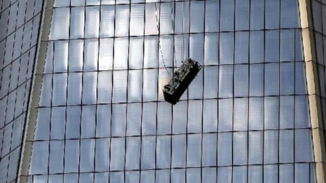 I due operai sono rimasti in bilico su un ponteggio quando uno dei cavi che lo sorreggeva dal tetto della torre si è spezzato. Il ponteggio è rimasto a dondolare dall'alto mentre scattavano immediatamente i soccorsi. One Trade Center ha 104 piani ed è alto 541 metri (1.776 piedi, il numero dell'anno dell'Indipendenza americana). Grazie a una vertiginosa antenna che si innalza sul tetto l'edificio è il piu' alto degli Stati Uniti. I due lavavetri non sono rimasti feriti, ma l'avventura a mezza quota rischia di lasciare un segno sulla loro salute emotiva.