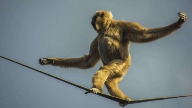 Le scimmie, si sa, sono dei veri e propri "mostri" di agilità. Ma oltre ad arrampicarsi, saltare e correre qua e là sanno anche... camminare a due zampe su una corda, sospesi nel vuoto. Un fotografo inglese, il 22enne Kurisu Mills, si è imbattuto in un gibbone provetto che ha regalato un'esibizione da provetto equilibrista nello zoo di Chester.