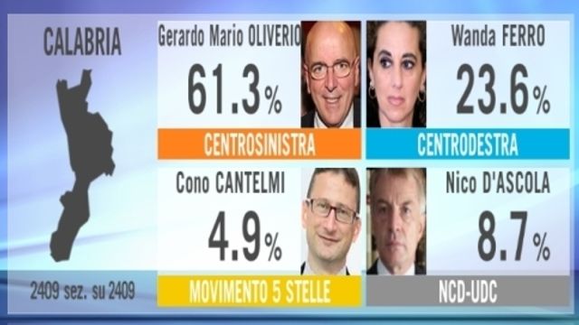 Calabria, vittoria netta di Oliverio - Il centrosinistra strappa, e nettamente, la Regione Calabria al centrodestra. Terminato lo spoglio, il candidato del Pd Mario Oliverio ha ottenuto il 61,3% dei suffragi. Il suo principale sfidante, Wanda Ferro (Fi-Fdi) il 23,6%. Supera lo sbarramento anche Nico D'Ascola (Ncd-Udc), con l'8,7% dei voti.