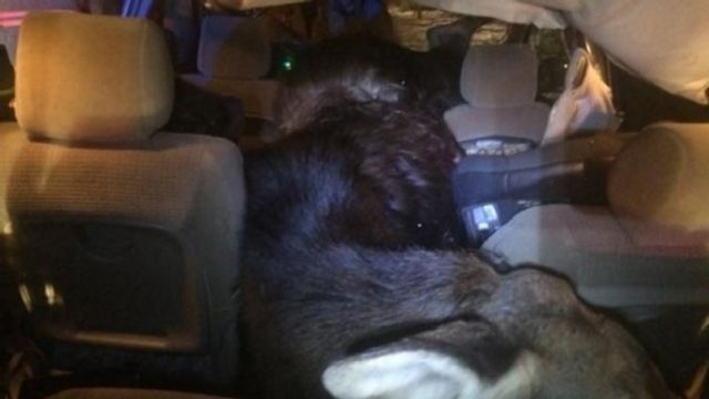 Investe con la sua auto un alce che va a finire completamente dentro il suo abitacolo. Nell'incidente l'uomo alla guida del minivan, Mark Forino, è rimasto illeso, sfiorato dal corpo dell'animale. Lo scontro tra animale e macchina è avvenuto nello Stato del Maine su una strada statale. Forino, 34 anni, di Presque Isle, ha detto che a un certo punto l'alce gli ha attraversato la strada e non è riuscito ad evitarlo.