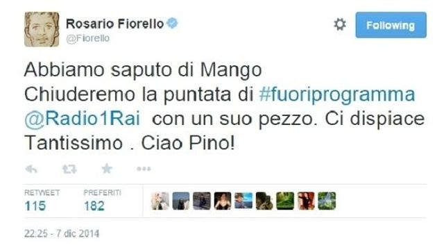 "Canta ancora per noi, là... dove sei adesso", è il triste messaggio di Eros Ramazzotti. "Voce nella voce, luce nella luce, pace nella pace", scrive invece Claudio Baglioni. "Grazie Mango della tua Voce unica che splende di luce come te. Non smettero' mai di emozionarmi con le tue canzoni", posta Gianna Nannini. Secondo Gianni Morandi "la musica italiana ha perso uno dei suoi interpreti migliori... se ne è andato cantando... Ciao Mango, resterai con la tua magica voce dentro i nostri cuori".