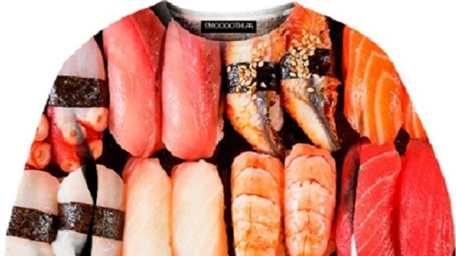Gli amanti del sushi saranno felici di scoprire che la celebre pietanza nipponica è entrata dentro il guardaroba: sono sempre di più gli indumenti che citano sashimi, uramaki e ravioli al vapore. Ci sono la borsetta e la felpa, il calzino e i leggins: per i golosi di pesce crudo e di curiosità condite in salsa di soia, non mancano davvero le possibilità.