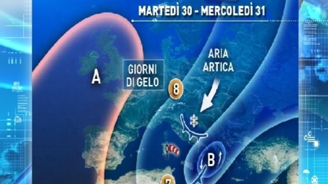 Le temperature scenderanno ancora, con gelate diffuse in mattinata al Centronord e zone interne del Sud, massime in generale inferiori alla norma. Previsti -3 gradi per Campobasso, -2 gradi per L'Aquila, -1 grado per Potenza, 2 gradi per Udine, Perugia, Rieti, Viterbo, 3 gradi per Brescia, Piacenza, Trieste, Pescara, Ancona, 4 gradi per Bergamo, Torino, Trento, Venezia, Roma, Bari, 5 gradi per Aosta, Cuneo, Bologna, Bolzano, Rimini, Treviso, Verona, Firenze, Grosseto, Taranto, Sassari, 6 gradi per Milano, Novara, Pisa, Brindisi, Catanzaro, Napoli, 7 gradi per Lecce, 8 gradi per Crotone, Alghero, 9 gradi per Genova, Imperia, Lamezia, Cagliari, Olbia, 10 gradi per Messina, Trapani e 11 gradi per Catania e Palermo. Venti forti da nord-nordest con raffiche fino a 70 km/h al Centrosud e sull'alto Adriatico.
