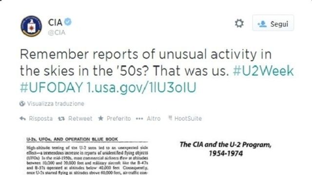Dopo cinquant'anni di teorie, voci e sospetti, la Cia ha ammesso che i presunti Ufo avvistati tra gli anni Cinquanta e Sessanta erano frutto di test segreti dell'intelligence con gli aerei spia Lockheed U-2, il cui primo volo risale al 1° agosto 1955. Nell'account ufficiale su twitter, la Cia scrive: "Le notizie sull'attività inusuale nei cieli negli anni Cinquanta? Siamo stati noi".