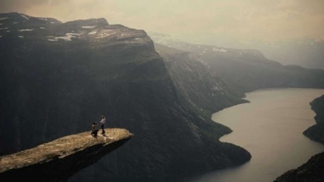 Il momento in cui si chiede alla propria donna di convolare a nozze è magico ed emozionante di suo. Se poi la proposta viene fatta nella cornice di uno dei più bei paesaggi del mondo, quel momento diventa immortale. Il 21enne belga Harald Six ha chiesto la mano della sua fidanzata Hanna "sospesi" a 700 metri di altezza sulla Trolltunga, la celebre roccia sporgente che affaccia sul lago Ringedalsvatnet, in Norvegia.