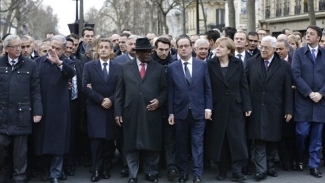 Una cinquantina di capi di Stato e di governo del mondo hanno preso parte alla manifestazione di Parigi per commemorare le vittime degli attentati. Oltre alle autorità civili e religiose francesi, erano presenti anche il premier italiano Matteo Renzi, il presidente palestinese Abu Mazen, il premier israeliano Benjamin Netanyahu, il re di Giordania Abdallah e il cancelliere tedesco Angela Merkel.
