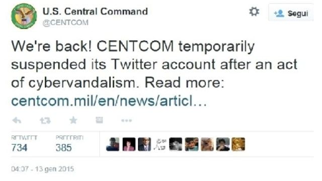 "Siamo tornati". Con questo tweet, il comando centrale Usa ha comunicato di aver riattivato il proprio account @Centcom dopo l'attacco hacker Isis. "Il Centcom ha temporaneamente sospeso il suo account dopo un atto di cyber vandalismo", è scritto su Twitter. Simpatizzanti non meglio specificati dello Stato islamico si erano inseriti sotto il nome di "Cybercaliphate", con una foto di un militante jihadista con la kefia bianca e nera.
