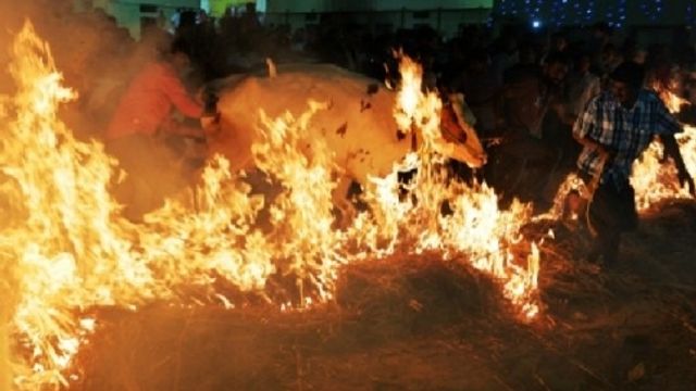 Tori e mucche sfilano vicino al fuoco, le donne preparano il pongal, un distillato di latte e riso, e gli uomini si immergono nelle acque del Gange. E' il rito di quattro giorni che gli hindu celebrano per festeggiare il passaggio del sole nella costellazione del Capricorno, evento considerato di buon auspicio, e scacciare via il malocchio.