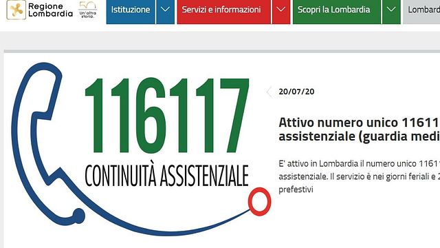 E' attivo in tutta la Lombardia (fatta eccezione per Brescia) il 116117, vale a dire il numero unico europeo di continuità assistenziale (ex guardia medica). Consente l'accesso alle cure mediche non urgenti e concorre alla gestione della domanda assistenziale a bassa intensità. Lo comunica la Regione, specificando che il servizio, gratuito, è attivo dalle 20 alle 8 nei giorni feriali e 24 ore su 24 nei festivi e prefestivi.