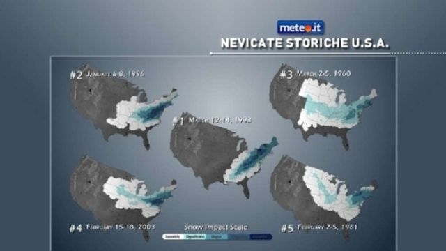Sulla costa nordest degli Stati Uniti sono in atto intense nevicate che hanno paralizzato grandi città come New York. Gli studiosi della NOAA (National Oceanic and Atmospheric Administration) hanno stilato una graduatoria delle più violente bufere di neve che hanno colpito gli Stati Uniti nel Dopoguerra attraverso un sistema denominato "Northeast Snowfall Impact Scale", che individua per ciascuna bufera di neve cinque categorie di "severità".