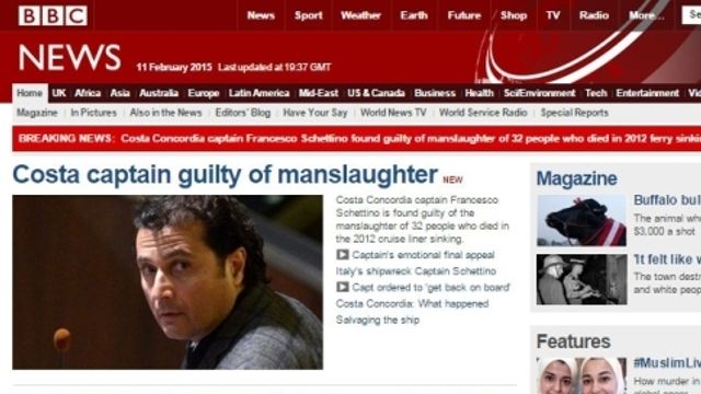 Dalla Bbc alla Cnn, la condanna a 16 anni e un mese a Francesco Schettino per il naufragio della Costa Concordia e' in apertura dei maggiori siti di informazione del mondo. "16 anni per 32 morti", titola la Cnn. "Il capitano della Costa Concordia condannato per omicidio volontario", scrive la Bbc.