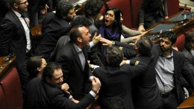 Rissa in aula, deputati in piedi su banchi - In un clima di forte tensione per la bagarr causata da M5s, la rissa è scoppiata improvvisamente tra un deputato di Sel ed uno del Pd, con il primo che si è slanciato verso il secondo gridando "pezzo di m...". Immediato l'intervento dei rispettivi colleghi dei due deputati e dei commessi, e la sospensione della seduta - ancora una volta - da parte del vicepresidente Giachetti.