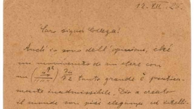 Una lettera in lingua italiana che avrebbe scritto a mano Albert Einstein sarà presto battuta all'asta a Boston. "Caro signor collega...", è l'incipit della missiva, destinata al fisico Giovanni Giorgi dell'Università La Sapienza di Roma e datata 12 luglio 1925. Il padre della Relatività, nella lettera, tratta proprio della teoria da lui formulata, scrivendo: "Non dubito della sua validità".