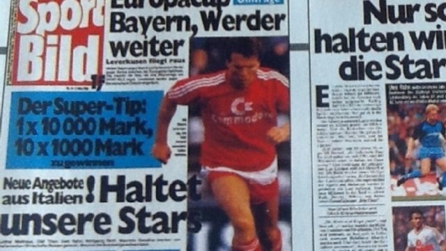 © tgcom24|La prima pagina di "Sport Bild" con l'articolo sulla "fuga" dei campioni tedeschi verso l'Italia della primavera del 1988