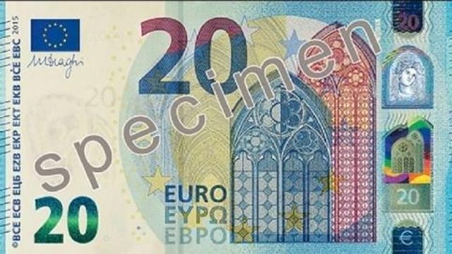 La Bce presenta al mondo la nuova banconota da 20 euro, che entrerà in circolazione a partire dal 25 novembre. Secondo il governatore Mario Draghi, il nuovo taglio "costituisce un'autentica innovazione nel settore della tecnologia delle banconote" per la sua esclusiva tecnologia di sicurezza detta "finestra con ritratto". Guardando la banconota in controluce, la finestra rivela in trasparenza, su entrambi i lati del biglietto, il ritratto della figura mitologica di Europa.