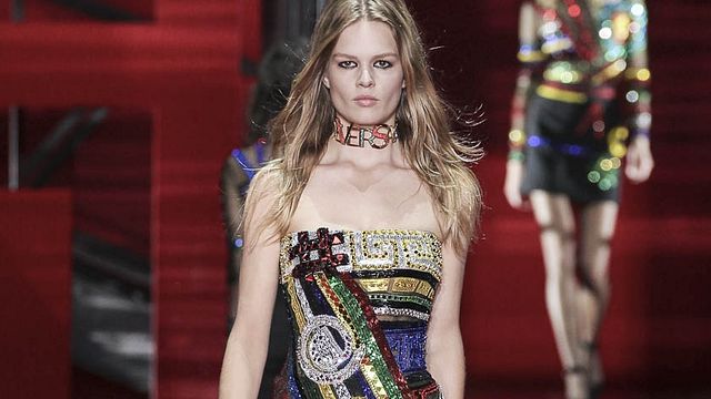 Nero, rosso intenso, lampi di verde e giallo: la donna di Donatella non ha nessuna paura di farsi notare, anzi. Anche quando indossa dolcevita e completo maschile, sceglie intricate trame e grandi cinture che sottolineano il punto vita, porta tacchi iperbolici sotto gli abiti attraversati da spacchi decisi e rivelatori, sceglie mise dove il nero pece è spezzato dai colori primari. Tutto è estremamente Versace: dalle silhouette alle stampe fino al lettering del marchio, accompagnato da hashtag rubati al mondo dei social media.