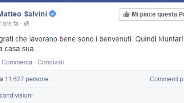 "Gli immigrati che lavorano bene sono i benvenuti. Quindi Muntari può tornare a casa sua": è un commento scritto sulla propria pagina ufficiale di Facebook dal segretario della Lega Nord Matteo Salvini, noto tifoso del Milan, che ha criticato così il centrocampista ghanese per la prestazione nella partita pareggiata dai rossoneri questa sera contro l'Hellas Verona. E' stato Muntari a causare il fallo da rigore che aveva portato gli scaligeri in vantaggio. E a difende Muntari arriva il suo ex compagno di squadra, Mario Balotelli, che dalla sua pagina di Instagram commenta: "Ma Salvini è serio quando dice questa cosa? E' pure un politico? Allora votate me è meglio".