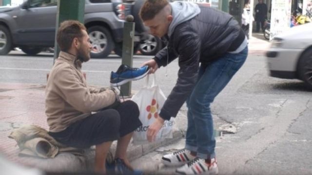 Sono solo quattro scatti ma stanno già facendo il giro del mondo. Sono le immagini che il fotografo greco Heraklis Pnevmatikakis ha letteralmente "rubato" nel centro di Atene immortalando un giovane greco che si avvicinava ad un barbone a piedi nudi e gli regalava un paio di scarpe sportive nuove di zecca. Le immagini, come spiega il sito Greekreporter, mettono in rilievo "non solo la dura realtà della crisi economica che ormai da sei anni affligge la Grecia, ma anche un grande gesto di compassione umana sempre più raro".