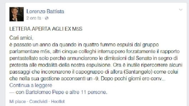 L'ex senatore grillino Lorenzo Battista, ora nel Gruppo Misto, chiama a raccolta i fuoriusciti del Movimento 5 stelle e, in una lettera aperta pubblicata su Facebook, chiede la "costituzione di un gruppo che ambisce a entrare in maggioranza". Battista, si legge, ipotizza anche "un'eventuale richiesta di avere un dicastero la cui direzione potrebbe anche essere ricoperta da un tecnico".