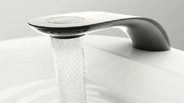 Le trame "geometriche" dei getti d'acqua che finiscono nel lavandino sono il risultato di tanti micro-spruzzi incrociati, che lasciano "vuoto" il centro del cilindro evitando così gli sprechi. Il meccanismo è reso possibile grazie a una doppia turbina installata nel "becco" del rubinetto che limita il flusso di acqua.