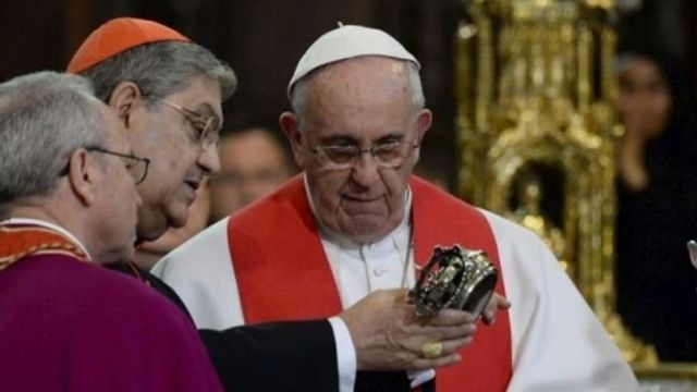Le suore di clausura, autorizzate a uscire dal convento, invadono gioiosamente l'altare della cattedrale di Napoli per stringersi intorno al Papa mentre il cardinale Crescenzio Sepe scherza in dialetto e poi dice: "E meno male che siete di clausura". Il video cliccatissimo in Rete.
