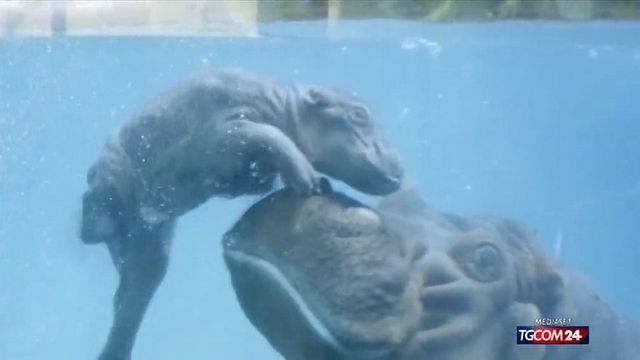 Grande festa allo zoo di San Diego dove è nato un cucciolo di ippopotamo. Il piccolo sgambetta felice in piscina insieme a mamma Funani, 30 anni, che lo aiuta a fare i primi movimenti nella vasca. E' nato sott'acqua, ma la madre deve aiutarlo a uscire fuori, perchè i cuccioli sanno trattenere il fiato solo per 40 secondi.
