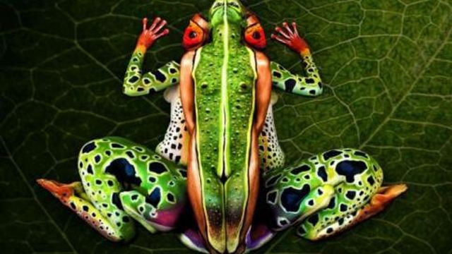 A prima vista sembra una coloratissima rana tropicale su una foglia in una foresta pluviale. In realtà è l'illusione creata dal pittore Johannes Stoetter, il mago del body painting. L'artista si ispira al mondo della natura. Nelle immagini in questione, la rana è la "somma" di cinque modelle sapientemente dipinte con i corpi intrecciati.
