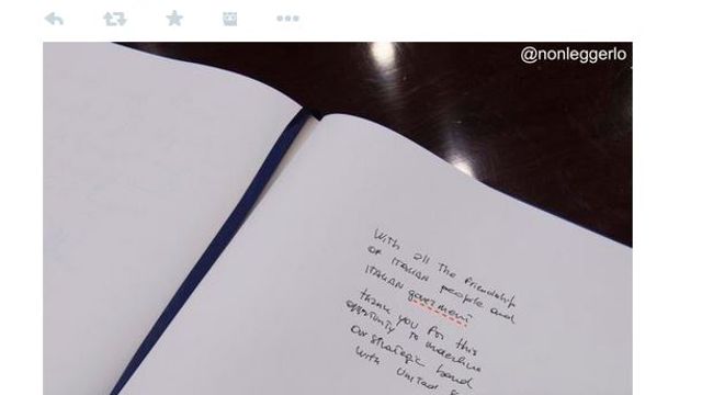 Sarà stata l'emozione di essere alla Casa Bianca oppure una distrazione eppure l'inglese di Matteo Renzi torna ad essere argomento di discussione. A far ridere i social è stato il libro presenze che il premier ha firmato prima dell'incontro con Obama. E l'amicizia del popolo italiano si è unita a quella dell'italian "goverment". Peccato che manchi una "N" e la dicitura esatta fosse "government". Vabbè, sarà per la prossima volta