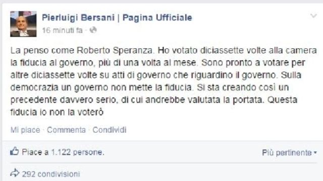 "Non la voterò". Pier Luigi Bersani annuncia così, su Facebook, la sua contrarietà alla scelta del governo di porre la fiducia sull'approvazione dell'Italicum. "Ho votato 17 volte la fiducia al governo, più di una al mese. Sono pronto a votare per altre 17 volte su atti dell'esecutivo che riguardino il governo. Sulla democrazia non si mette la fiducia", conclude l'ex segretario del Pd.