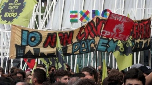 Non solo imbrattamenti e danneggiamenti ai danni di banche e società interinali, secondo il tipico copione no global, ma anche una lite intestina tra le anime diverse del movimento, tra black-bloc e giovani dei "collettivi", che hanno sfiorato la rissa. Il momento clou delle protesta organizzata è stato poco prima della partenza del corteo, quando due manifestanti sono saliti sulla struttura dell'Expo Gate, in centro a Milano, ed hanno affisso uno striscione con la frase "grande evento uguale grande bufala. No Expo: un altro mondo è possibile".