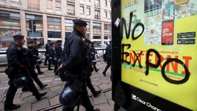 Un folto gruppo di antagonisti completamente vestiti di nero e con il volto coperto dai cappucci o dai caschi sfilano al corteo No Expo, pronti a colpire con estintori caricati non a schiuma ma a vernice. Si trovano nella coda della manifestazione e hanno bandana e cappellini che ricordano i black bloc. Quando sono in azione, altri attivisti bloccano le telecamere degli operatori e gli obiettivi dei fotografi.