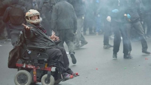 Casco in testa (per proteggersi ma anche per non farsi riconoscere), poncho e una sedia a rotelle. Davanti al corteo dei noexpo poi degenerato c'era anche questo signore di cui ancora non si conoscono le generalità. Sembrava voler mediare tra la parte facinorosa dei manifestanti e la polizia. Ma evidentemente il suo gesto non ha avuto buon esito.